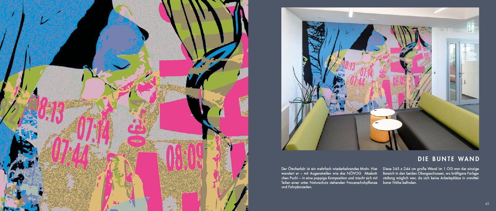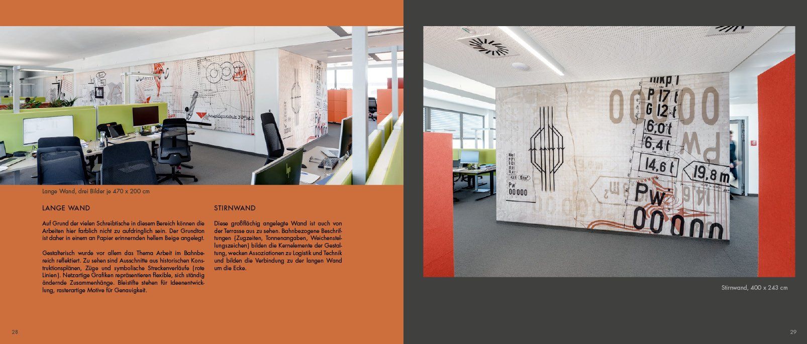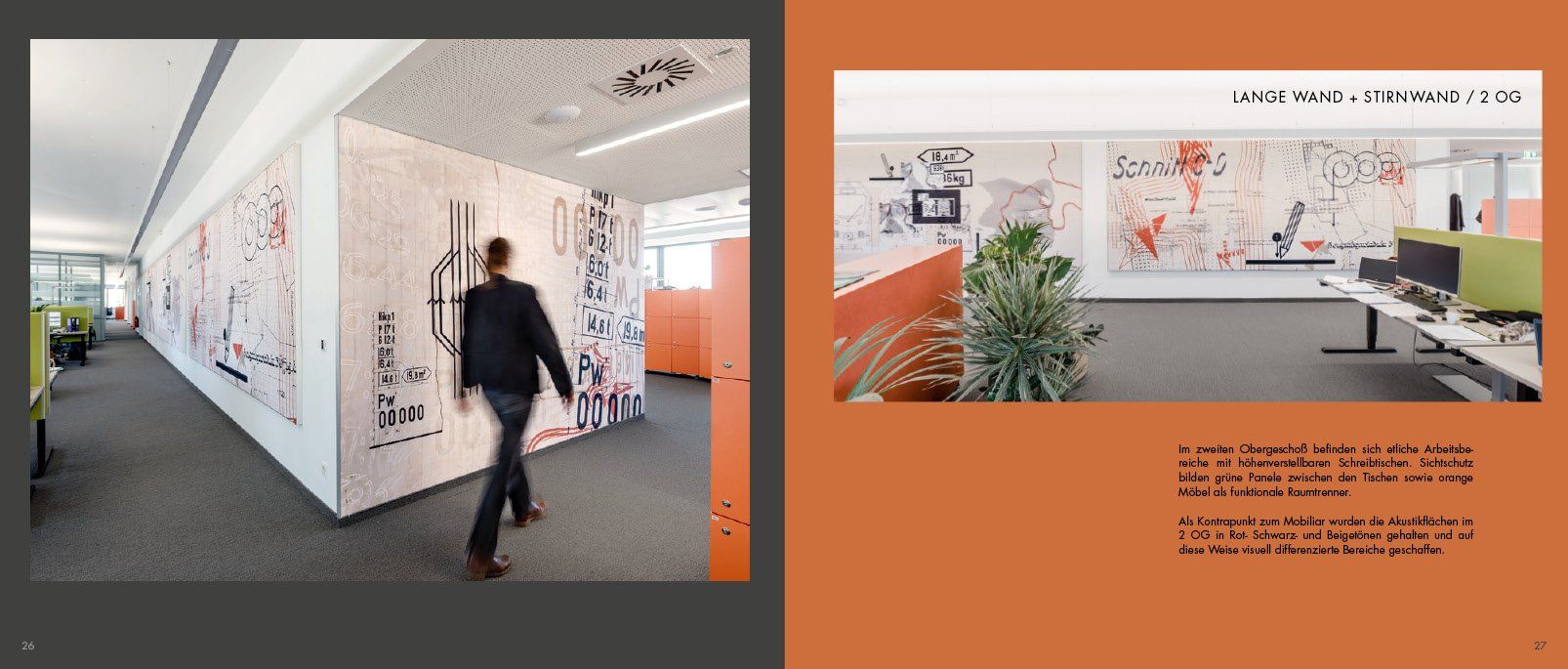 Gestaltung von insgesamt 150 m2 Akustikflächen (bauseitige Positionen vorgegeben) für das Foyer und 2 Etagen Großraumbüros, sowie Ausstattung der Betriebskantine mit 19 Bildern.