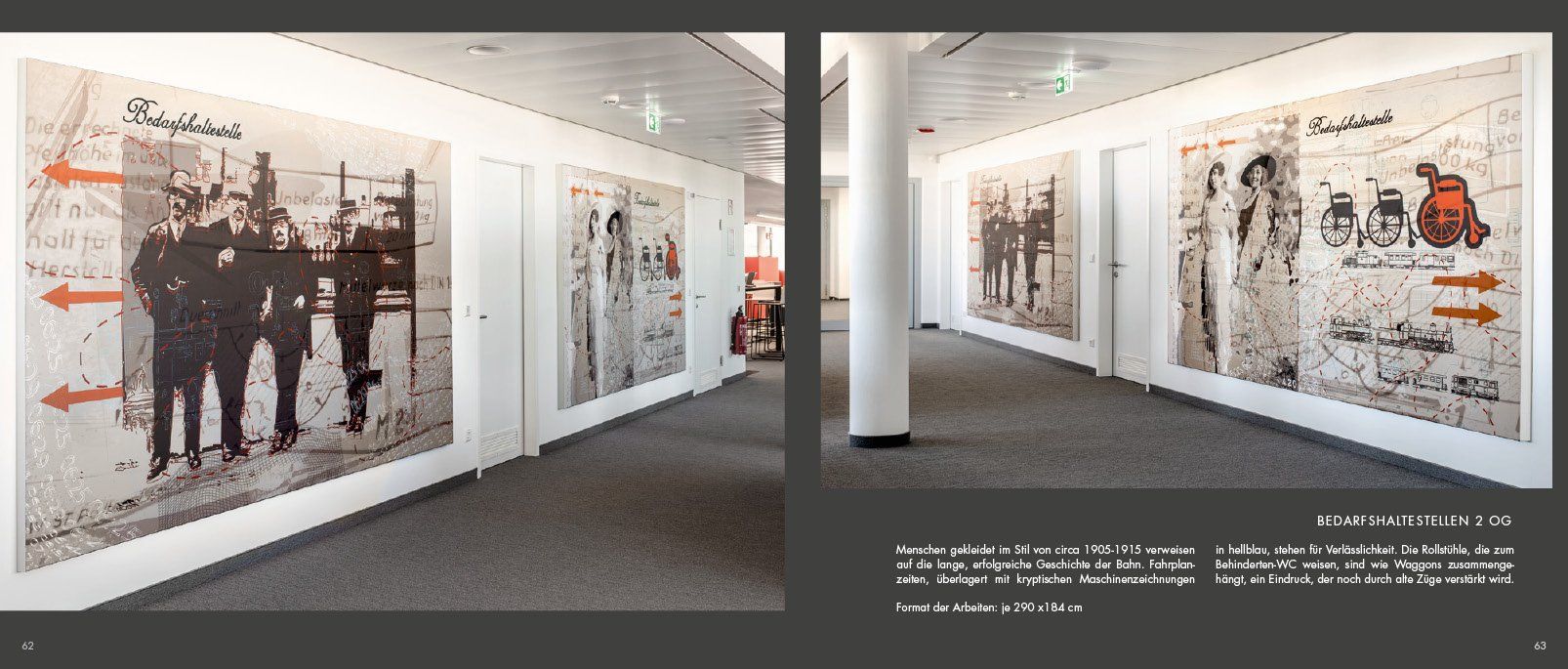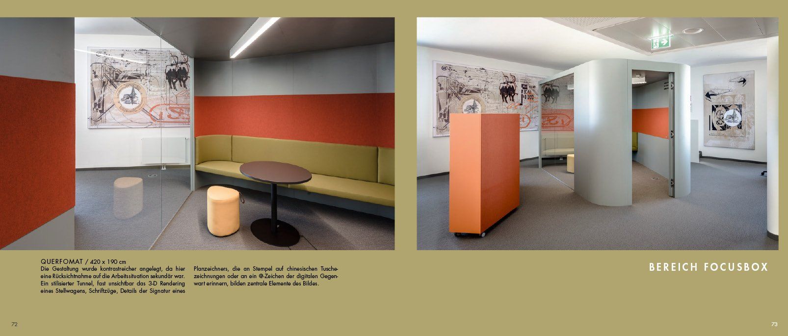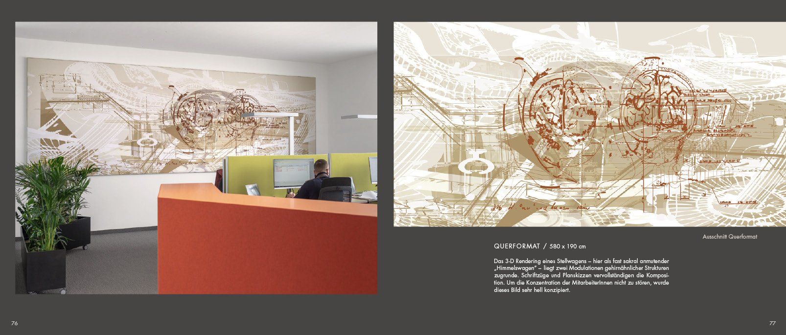 Gestaltung von insgesamt 150 m2 Akustikflächen (bauseitige Positionen vorgegeben) für das Foyer und 2 Etagen Großraumbüros, sowie Ausstattung der Betriebskantine mit 19 Bildern.